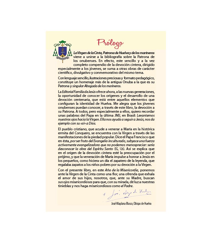 La Virgen de la Cinta, Patrona de Huelva y de los marineros viene a unirse a la bibliografía sobre la Patrona de los onubenses que es venerada en el santuario del mismo nombre, en la ciudad de Huelva.