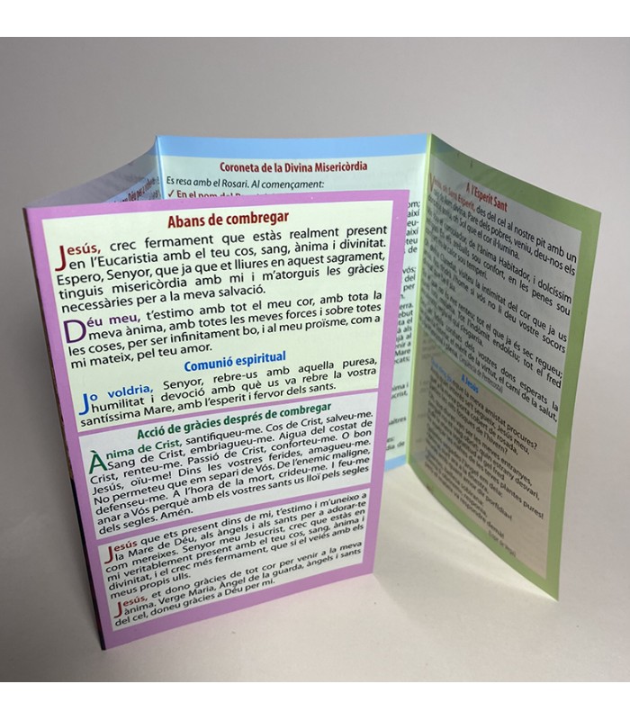 Inclou abans de combregar, comunió espiritual, acció de gràcies després de combregar, a Jesús crucificat, adoro te devote, no em mou el meu Déu per a voler-te, lloança, oracions de l’Angel a Fàtima, Coroneta de la Divina Misericòrdia, a l’Esperit Sant, a Jesús, lloances de desgreuge, oració per la pau, reflexió i oració a l’Arcàngel Sant Miquel.