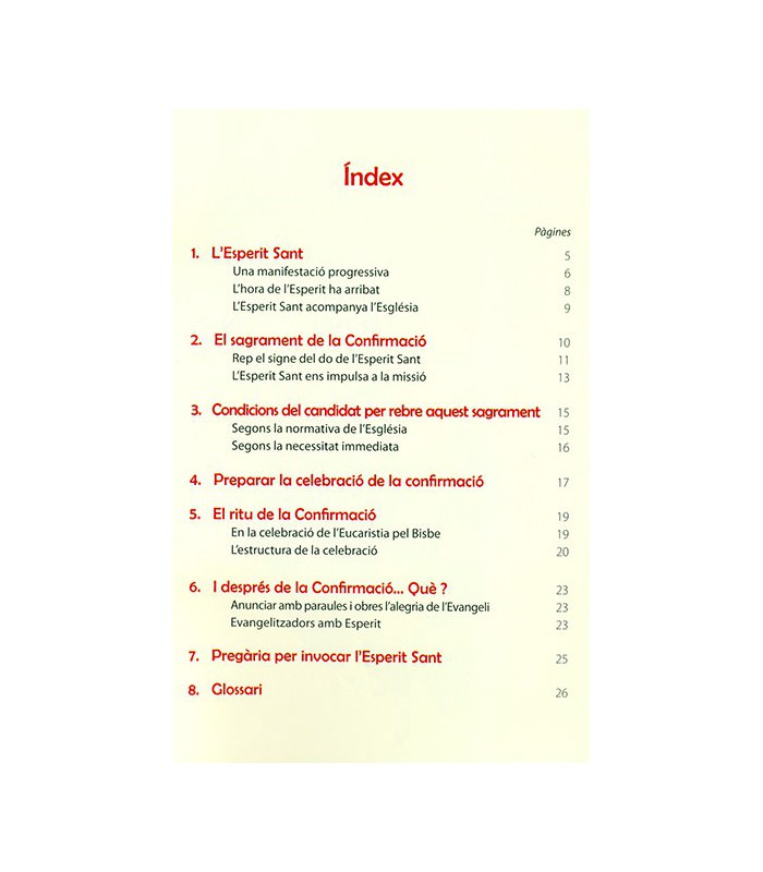 Aprofundeix en els continguts essencials el sagrament, les condicions del candidat per rebre el sagrament,la preparació immediata de la celebració, els diferents signes del ritu. Totaixò introduït per una reflexió sobre la Tercera Persona dela Trinitat, l'Esperit Sant, protagonista d'aquest sagrament que culminala iniciació cristiana; finalitza amb la invitació a anunciar amb paraules i obres l'alegria de l'Evangelii, en sintonia amb l'última exhortació apostòlica del Papa Francisco Evangelii Gaudium.