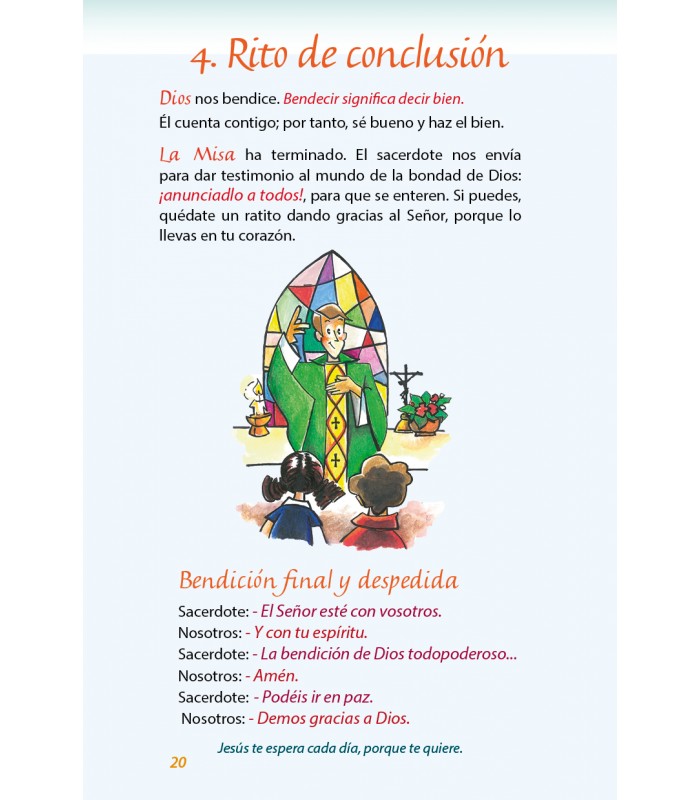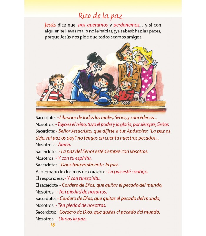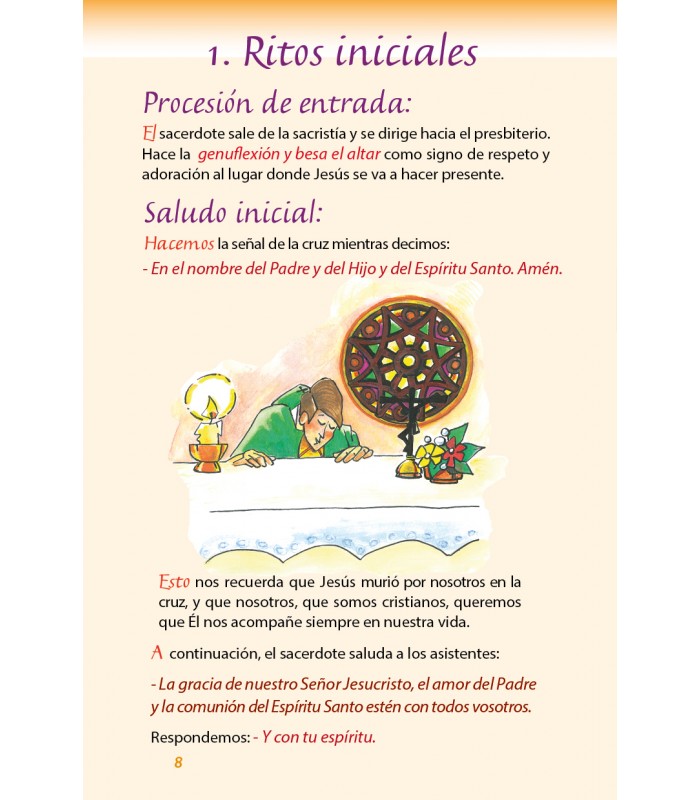 Pensábamos que, siendo la Eucaristía el centro de la vida cristiana, tendríamos que ayudar a los niños a comprender y participar en la celebración del santo sacrificio de la Misa. Así elaboramos un texto sencillo que muestra, con las palabras de los pequeños, la grandeza del misterio, y les ayuda a comportarse adecuadamente cuando están en la presencia De Dios.