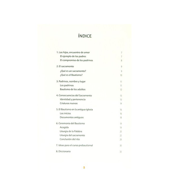 Entre los temas tratados figuran: El sacramento y sus efectos. El Bautismo en la historia de la Iglesia. Liturgia del sacramento. Aportaciones para el curso prebautismal: cuestiones sobre la fe, los hijos, autoayuda familiar, etc.