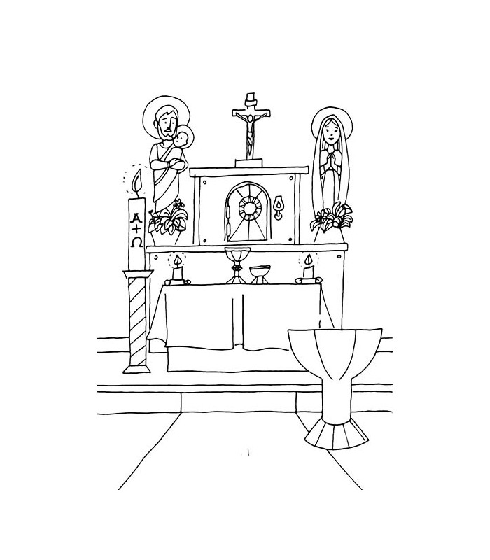 Dibujo del altar con diversos objetos para nombrar y colorear.