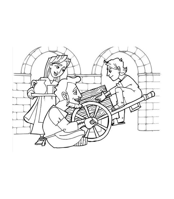 Jesús trabaja en la carpintería de su padre José. María les lleva la media mañana