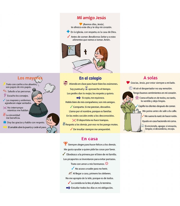 Original instrumento formativo, tanto para las catequesis o como regalo en las primeras comuniones. Plegado es un cuadrado; cada hoja recoge un campo de crecimiento: ciudadanos, los mayores, en la mesa, el respeto...
