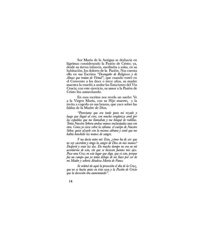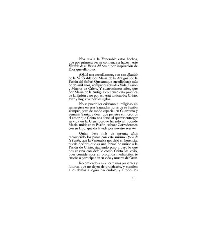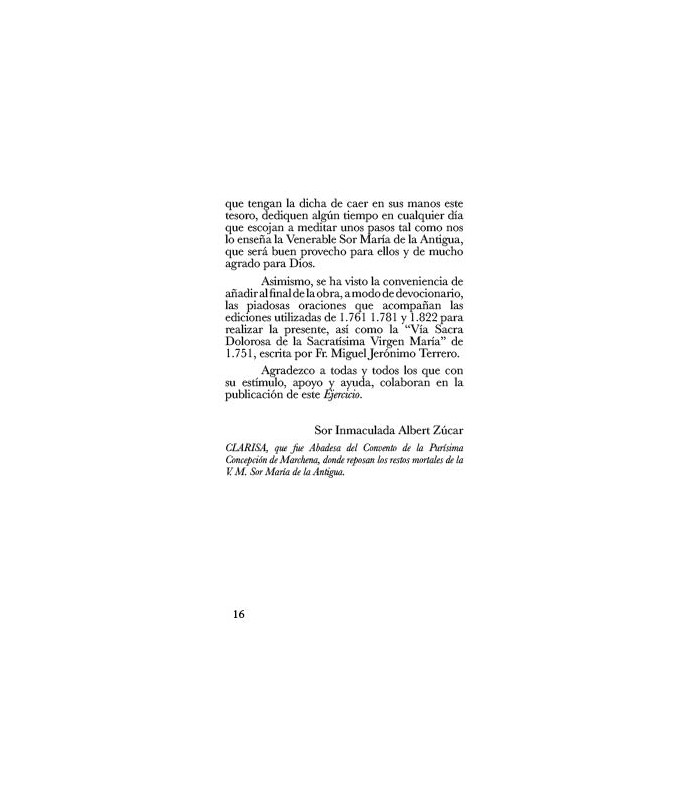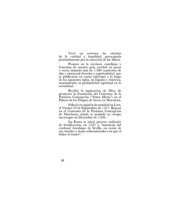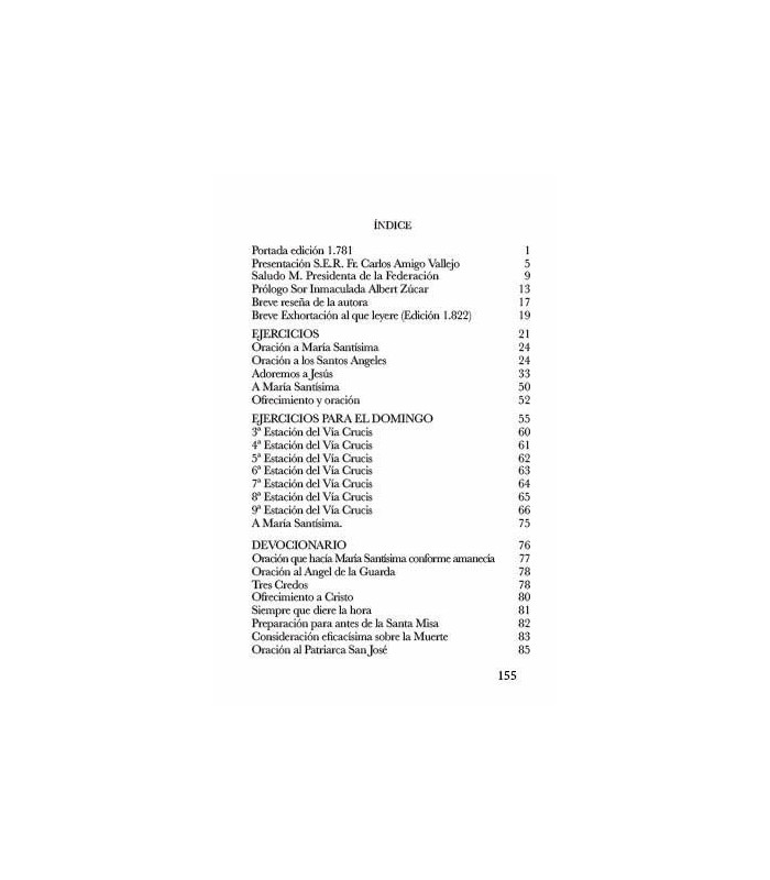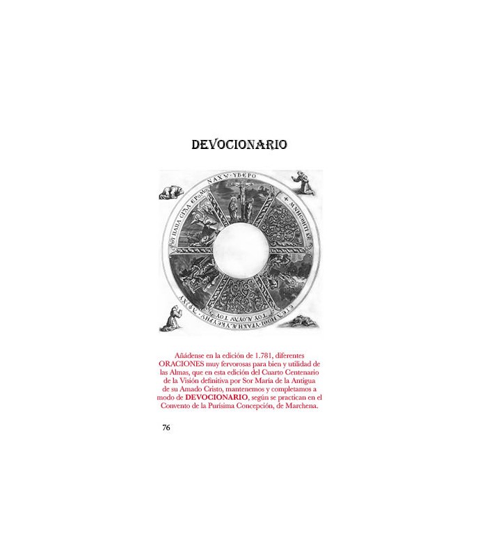 Son 156 páginas de honda espiritualidad que las Hermanas Franciscanas Clarisas de Marchena han transcrito de la edición realizada en 1.781 y 1.822, en las que se han adaptado al castellano actual algunas palabras caídas en desuso, para su mejor comprensión. La reedición de esta obra tiene especial valor por rescatar un texto valioso escrito en el siglo XVIII.