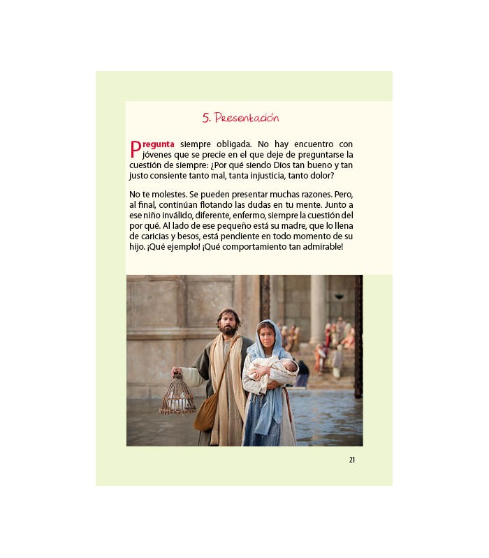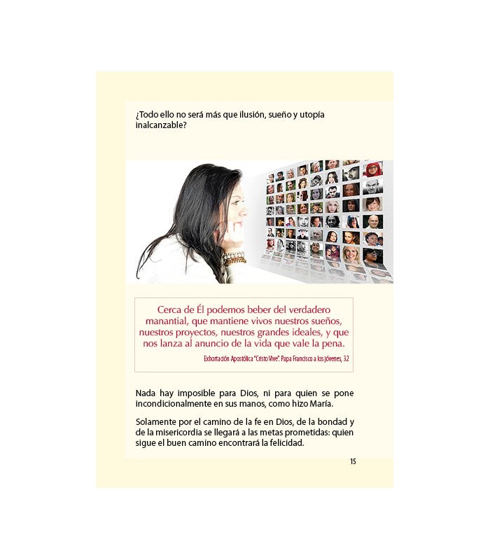 En recuadro se reproducen textos de la Exhortación apostólica "Christus vivit", del Sínodo de los Obispos sobre los jóvenes y de otras intervenciones del Papa. El texto, impreso a varias tintas, va acompañado de abundantes ilustraciones a todo color: hallamos reproducciones de muy bellas obras pictóricas relativas por lo común a los distintos misterios considerados, a lo que se añaden fotografías de escenas actuales de la vida y algún dibujo. El texto y las imágenes cumplen así una recíproca función complementaria". PABLO LAGO