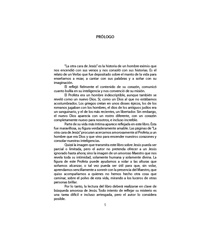 La otra cara de Jesús es una biografía no histórica de Jesús de Nazaret, narrada desde la perspectiva de uno que cuantos se acercaron al Señor: Ilnas Harabi. Suria, una joven de profunda inquietud y corazón infinito; Yumanina; adinerada mujer que vive su sufrimiento sonriendo, Lucas el leproso... son algunos de los personajes que, junto con Miryam, la madre del Profeta, Marcos o el sabio Nicodemo, nos revelan el rostro amable de Jesús y su corazón lleno del fuego de su amor.