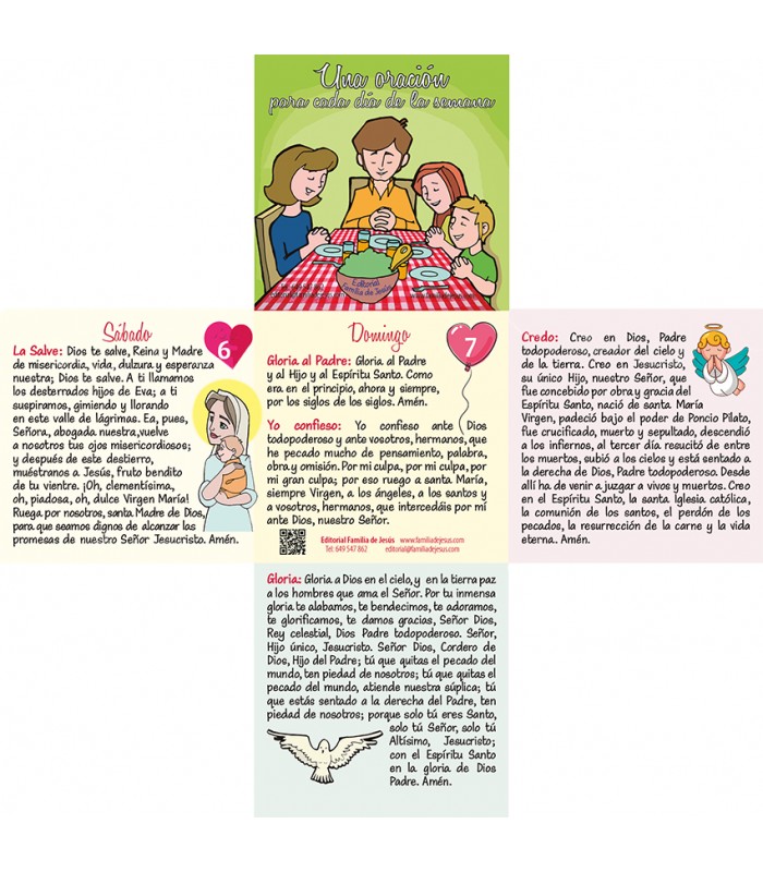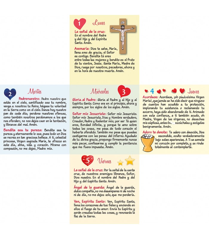 Recoge las oraciones más importantes del cristianismo: La señal de la Cruz, Avemaría, Padrenuestro. Bendita sea tu pureza, Gloria al Padre, Señor mío Jesucristo, Acordaos, Adoro te devote, Ángel de la guarda, Ven Espíritu Santo, Salve, Gloria al Padre, Yo confieso, Credo y Gloria.
