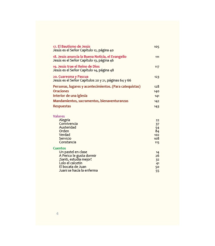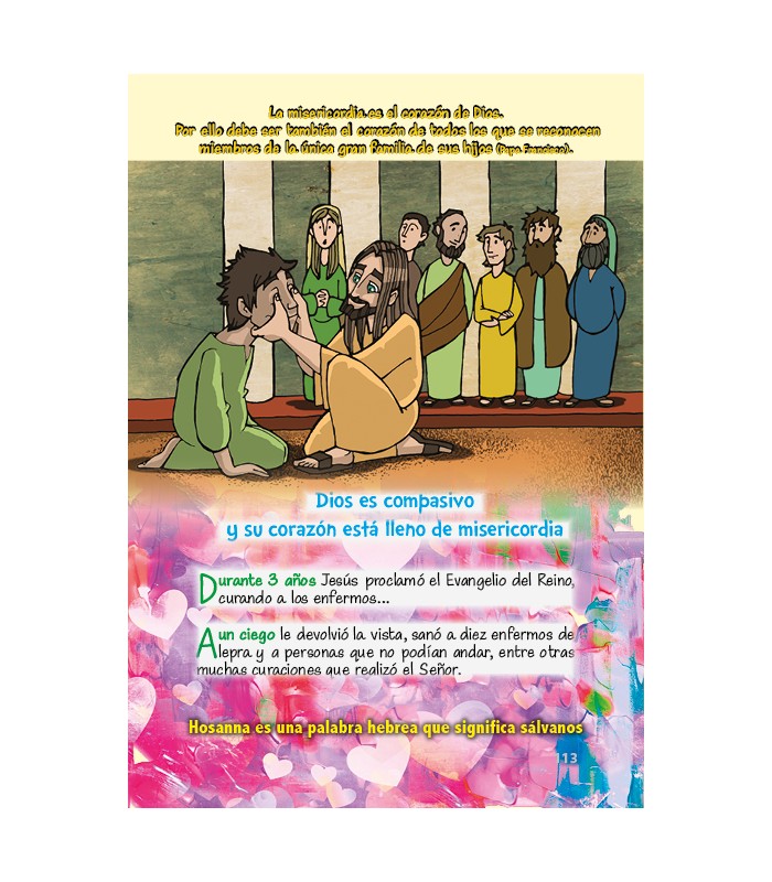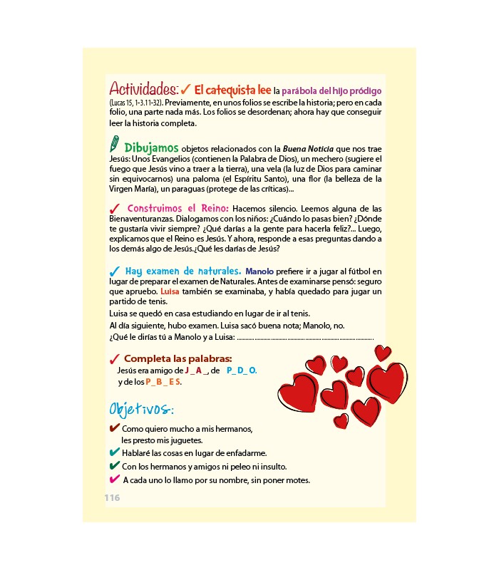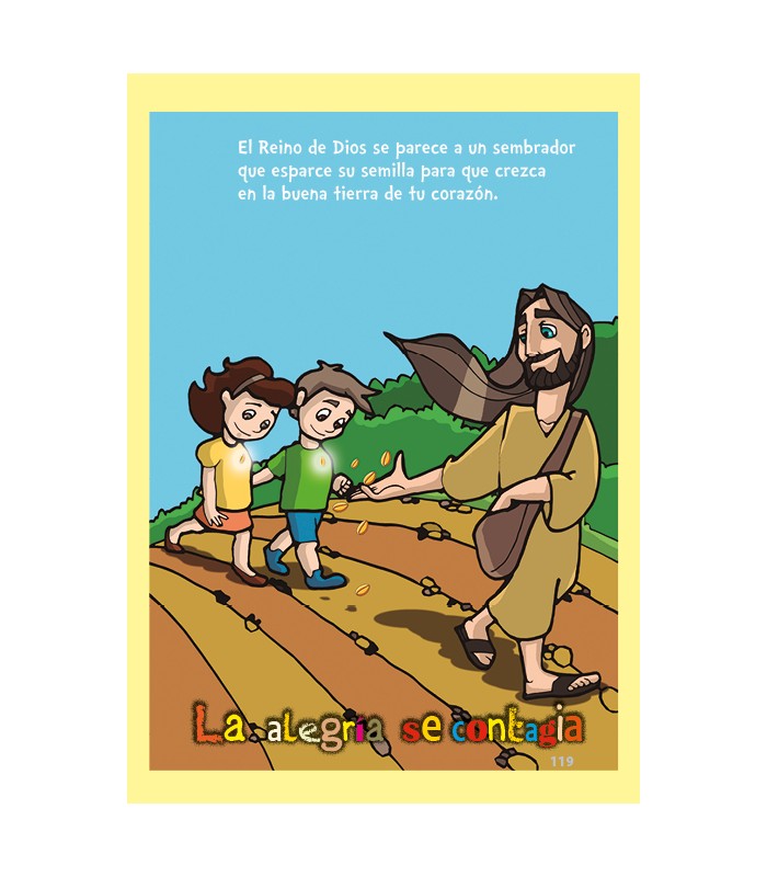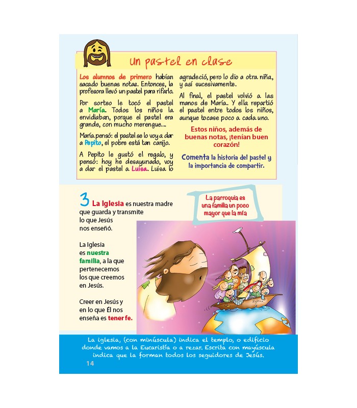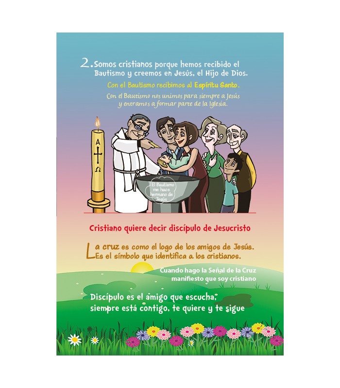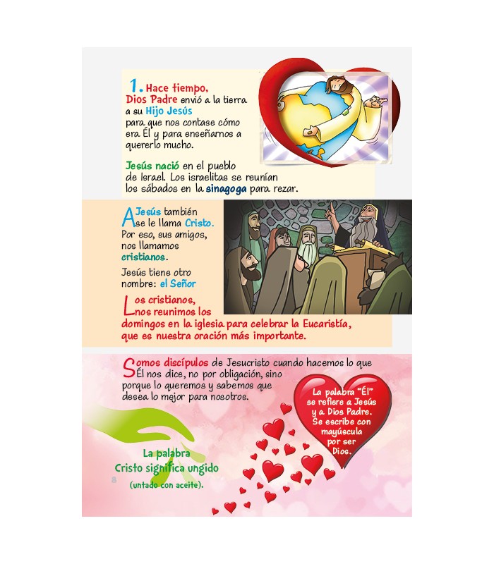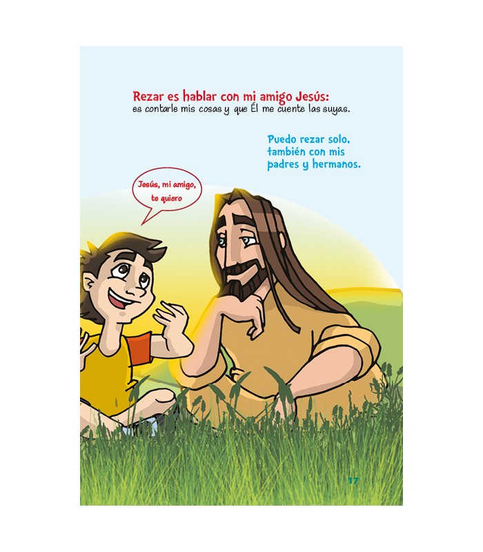 Se transmiten conceptos a través de las ilustraciones. El libro enseña a rezar a los niños, a amar a Jesús, y a ir, poco a poco, queriendo a su parroquia e insertándose en la comunidad cristiana.