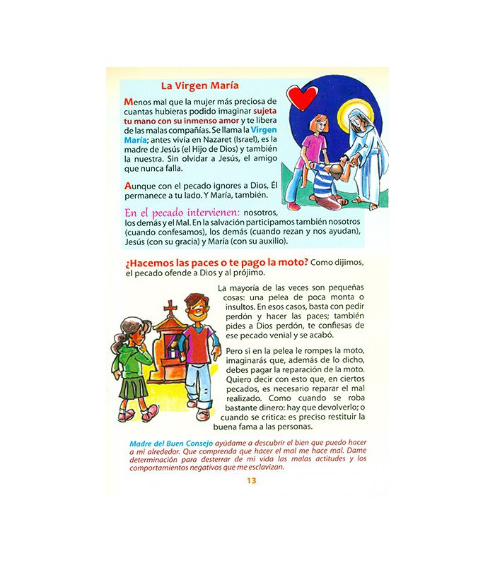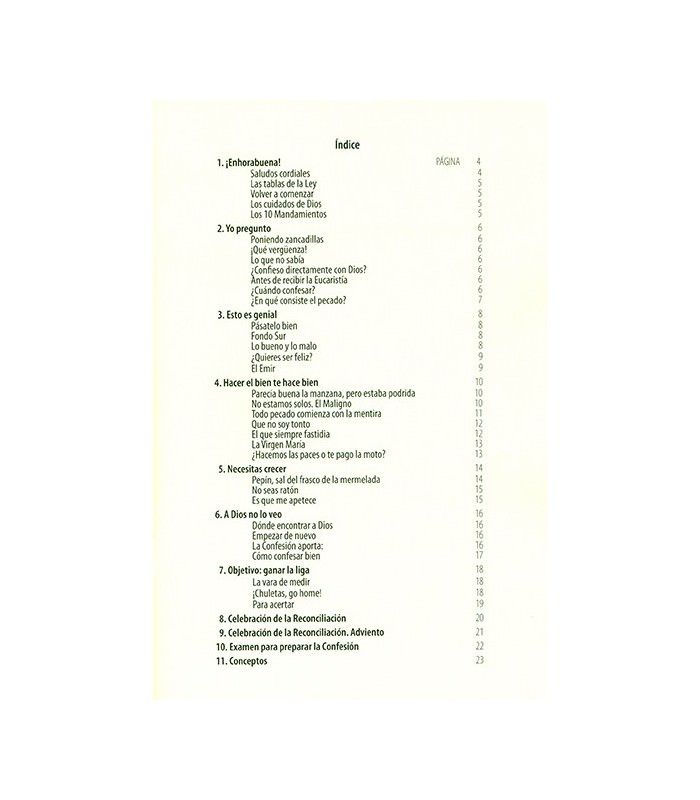 Escrito con el lenguaje y la mentalidad de los jóvenes: "No tengo pecados", "¿Confieso directamente con Dios?", "Es que me apetece", "En qué consiste el pecado", "A Dios no lo veo", "Volver a comenzar"..., estos y otros temas se abordan con claridad, alternándolos con historias divertidas: "Los cuidados de Dios", "Joe killer", "Pepín, sal del frasco de la mermelada", "La vara de medir"... El libro expresa la alegría de vivir en gracia.