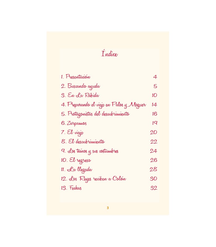 La vida y obra de Cristóbal Colón, narrada en 13 capítulos: buscando ayuda, en La Rábida, los preparativos del viaje, protagonistas…, finaliza con la repercusión de la obra colombina en la historia y un elenco de fechas significativas.