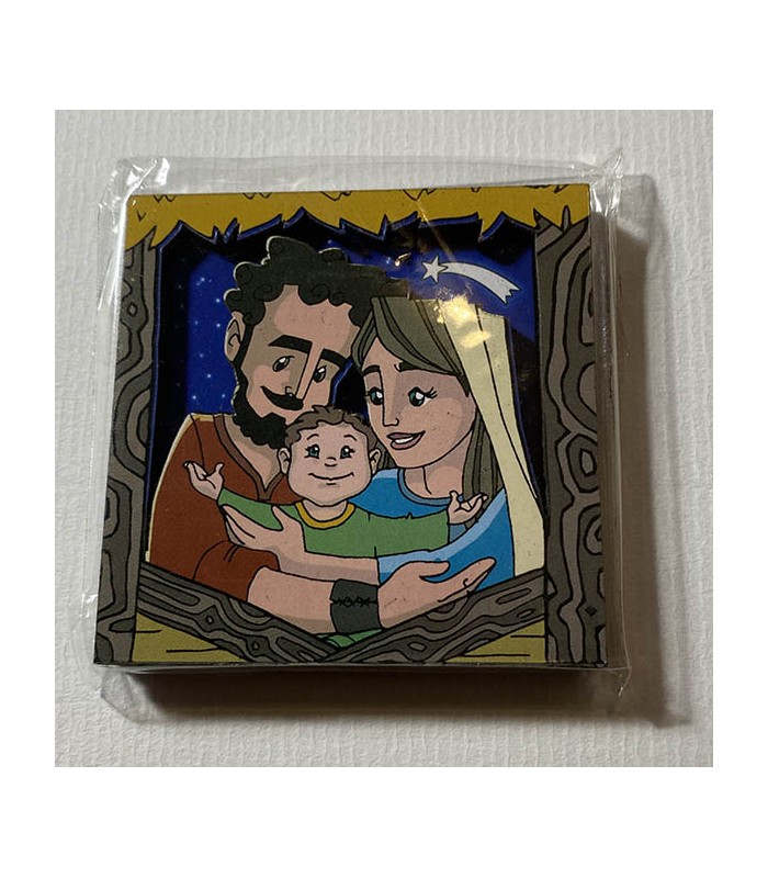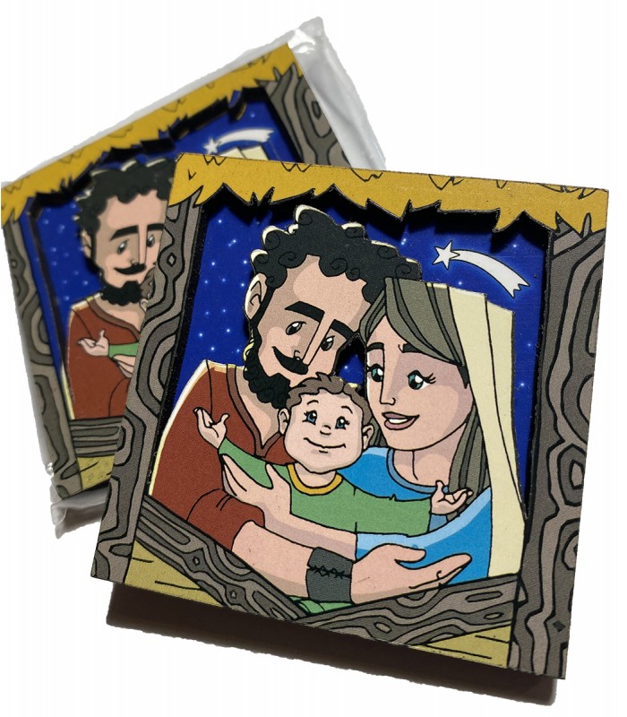 Precioso imán con la Sagrada Familia en el portal de Belén con piadosos rostros de Jesús, María y José.